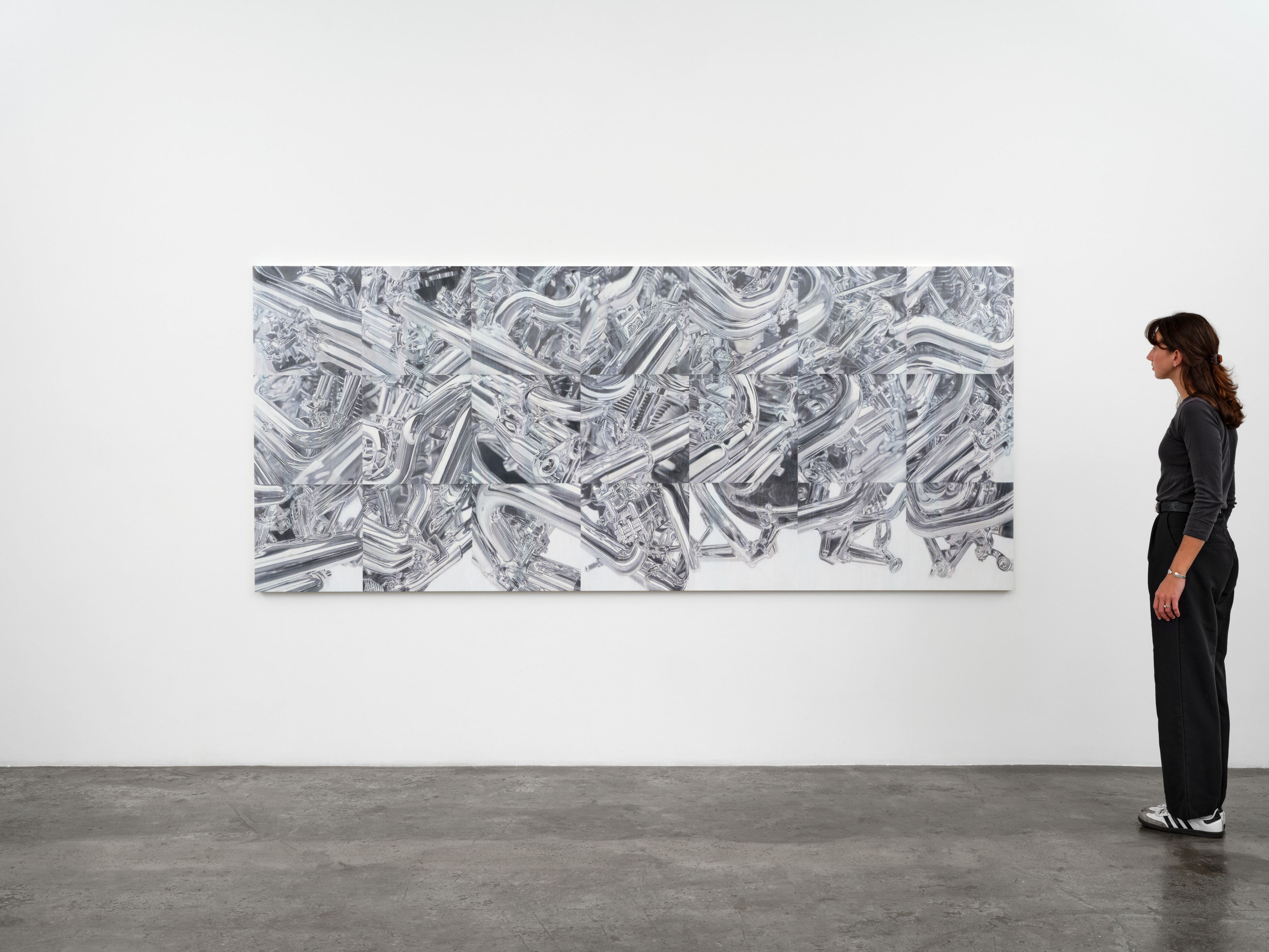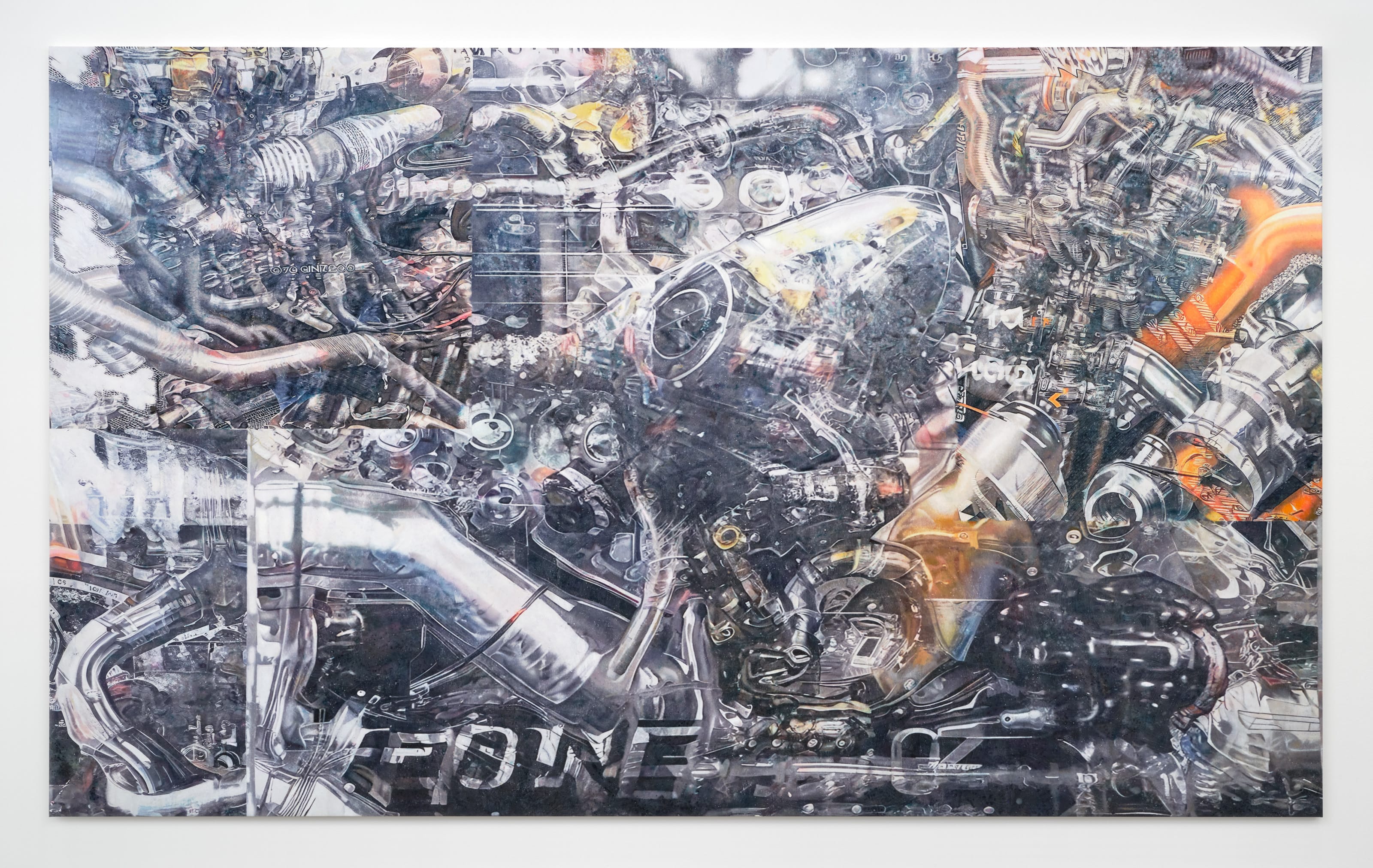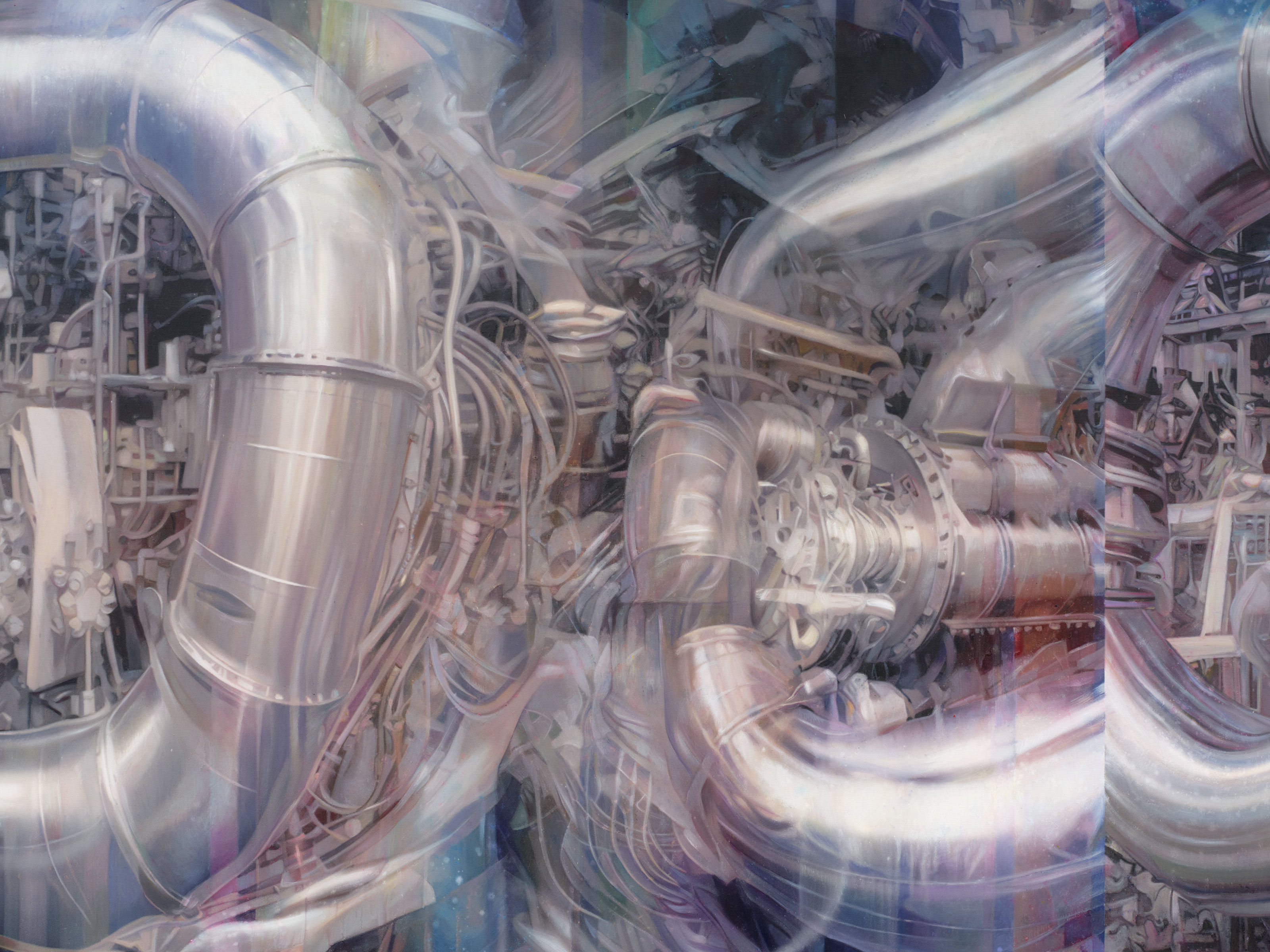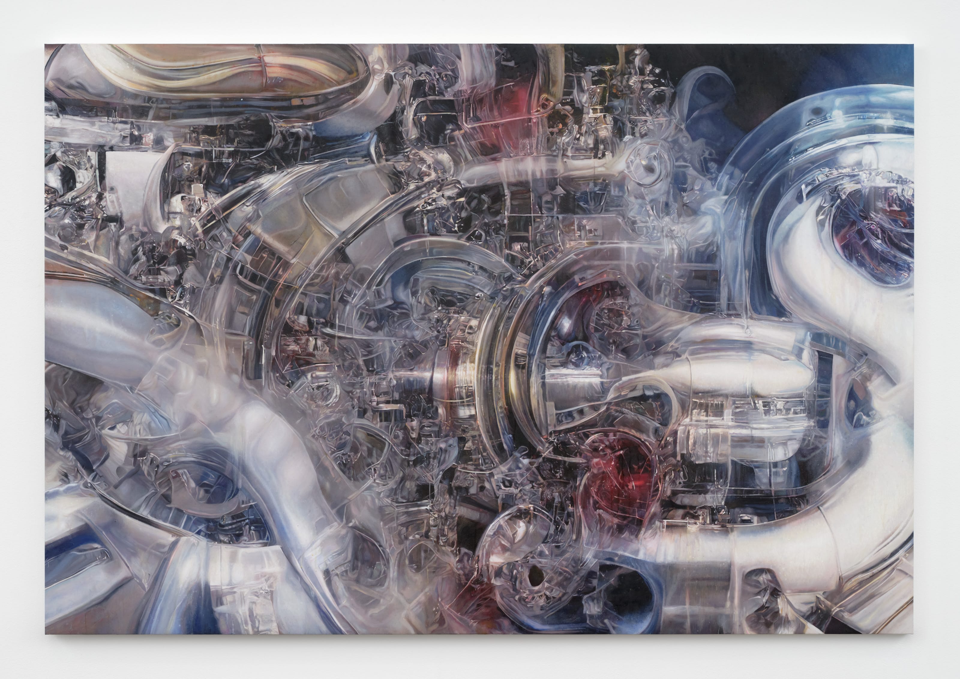 Timea Faulkner: Your paintings begin with photographs of machine parts and evolve through AI interpretation before you return them to physicality with paint. What draws you to this cyclical dialogue between hand and machine?